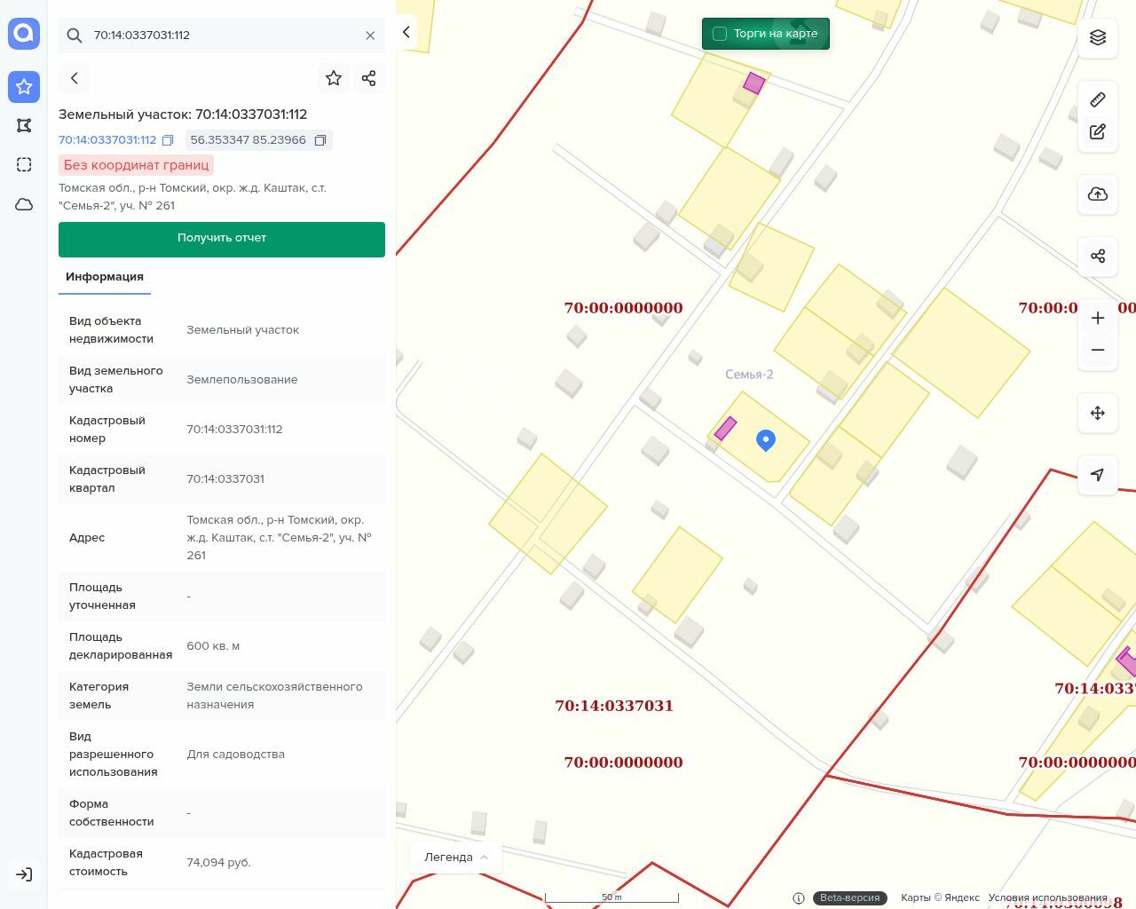Земельный участок с кадастровым номером 70:14:0337031:112, вид разрешенного использования: для садоводства, площадь: 600 кв.м., вид права: собственность, дата регистрации: 25.12.2008 г.